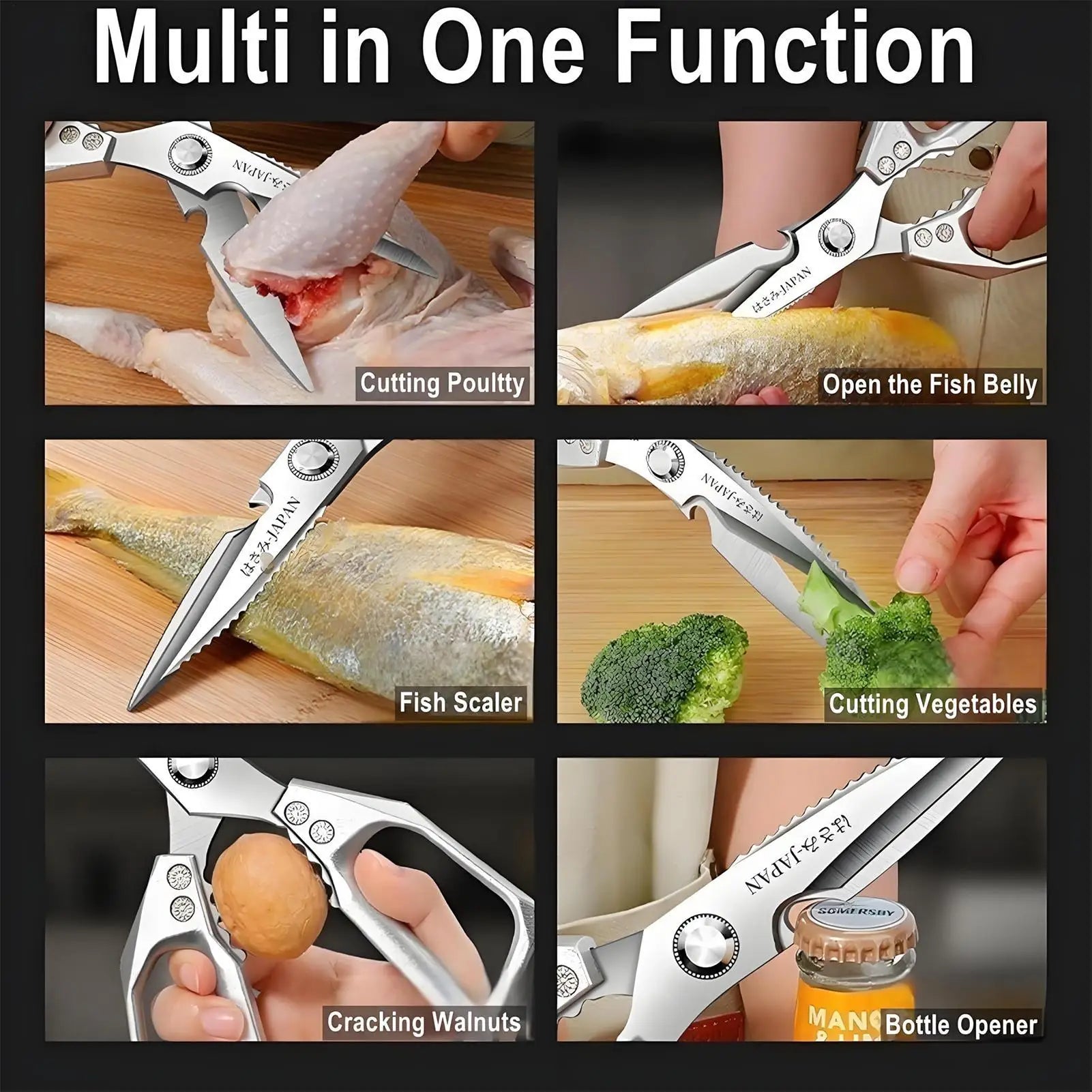 The Ultimate 6-in-1 Tool: Replaces multiple gadgets. Use it for cutting poultry, opening fish bellies, scaling fish, cutting vegetables, cracking walnuts, and opening bottles.